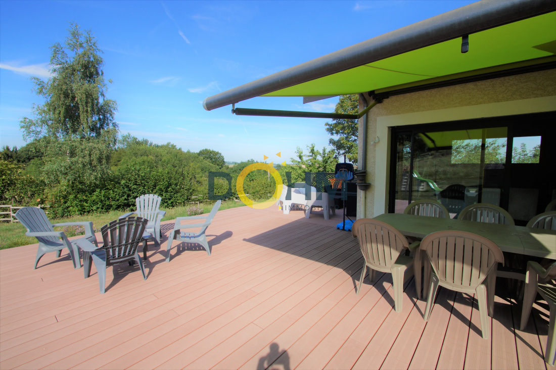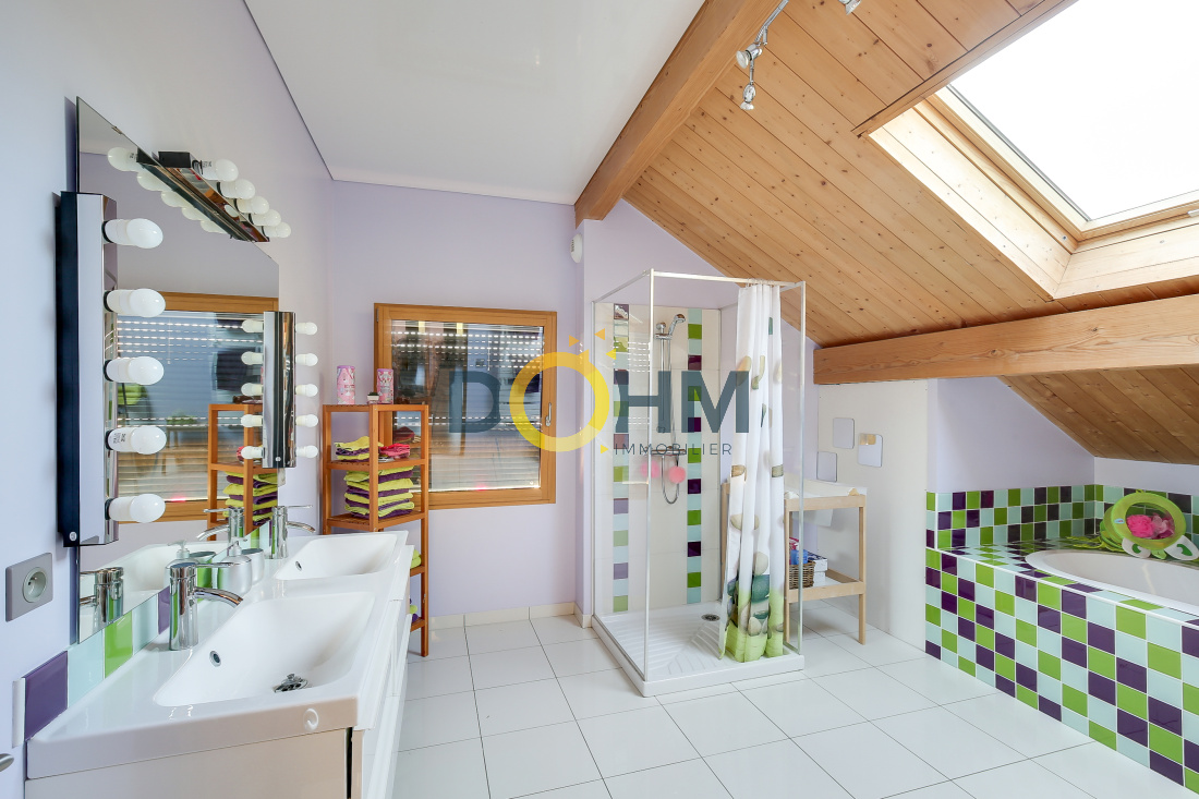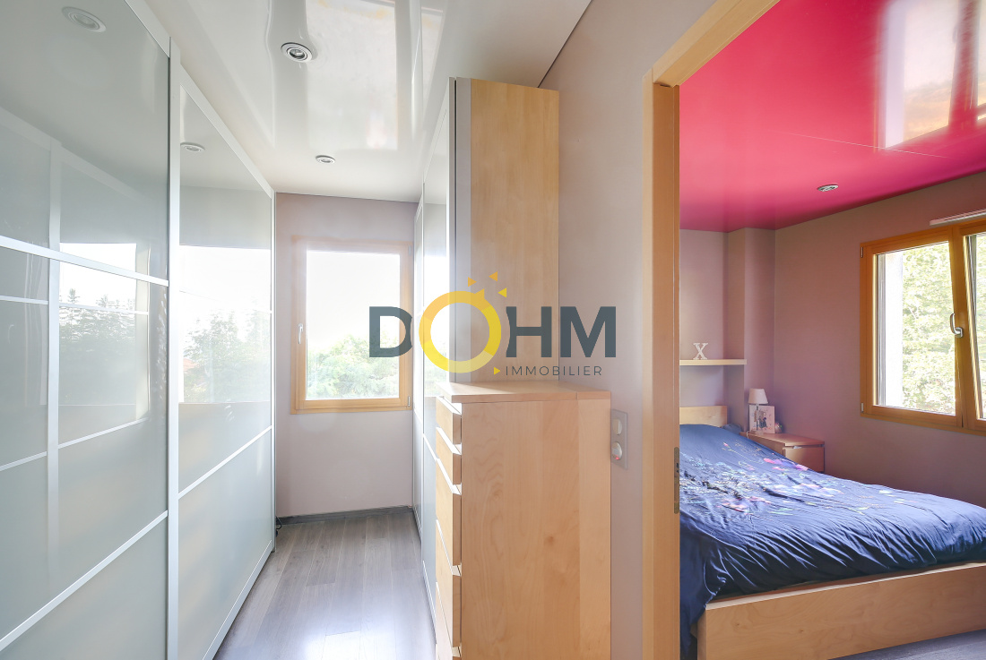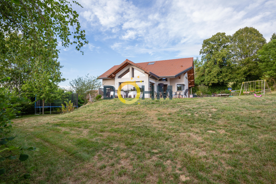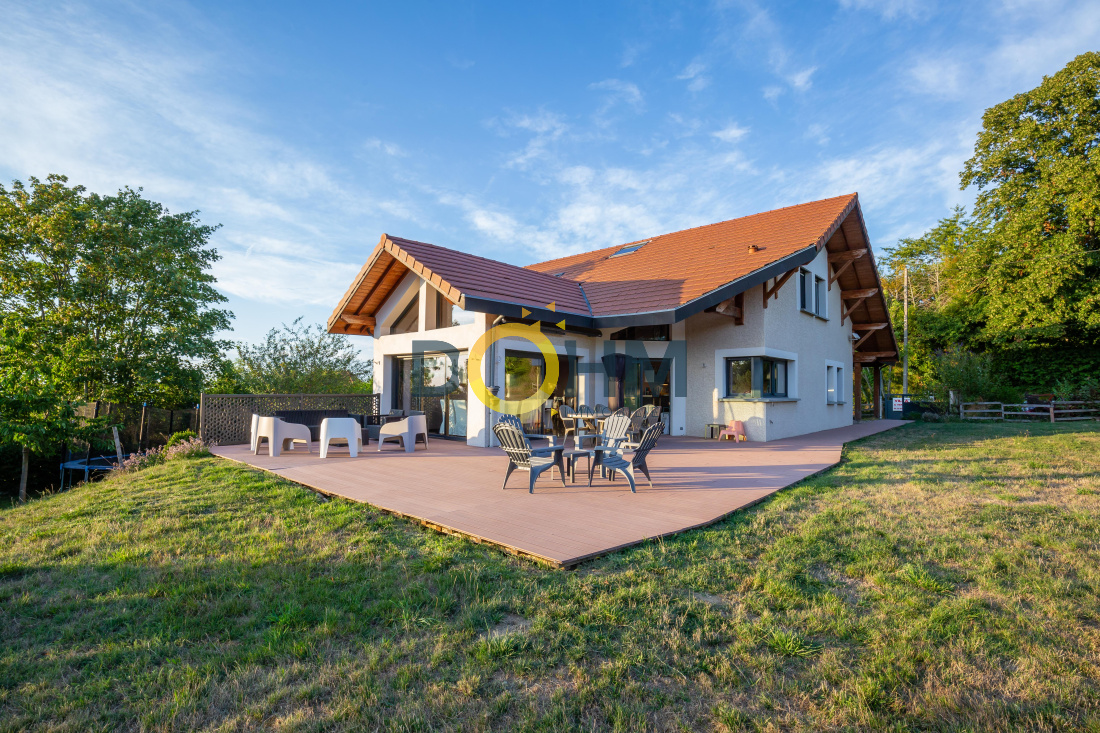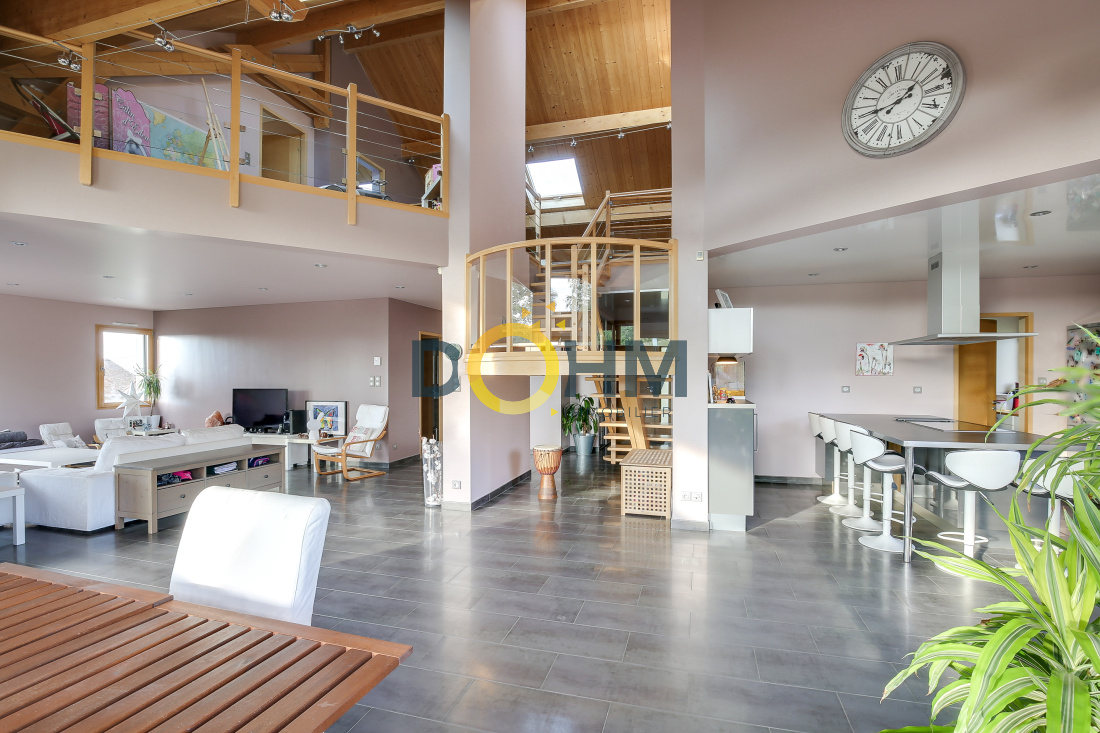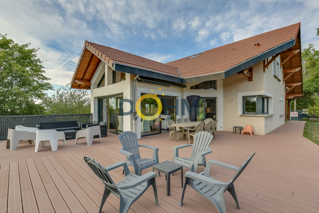 Secteur Lac de Paladru Dohm Immobilier vend maison d'architecte de 220 m2 construite en 2008 sur 2000m2 de terrain. Comprenant au rez de chaussée une grande pièce de vie de 70m2 très lumineuse, une cuisine équipée attenant à une buanderie et un cellier, une suite parentale avec salle d'eau, toilette et dressing, un toilette avec lave main. A l'étage, une grande mezzanine desservant 3 chambres ainsi qu'une salle de bain avec douche et baignoire. L'extérieur vous offre une grande terrasse composite de 120m2 ainsi qu'un jardin, une cour et un abri pour 2 voitures. La maison est composée d'un sous sol de 120m2 avec double portes motorisée, rangement, cave et chaufferie. Cette maison offre des matériaux de haute qualité, avec des plafonds tendus, des détecteurs de lumières, des menuiseries aluminium et bois, chauffage géothermie au sol rez de chaussée et étage, volets roulants, aspiration centralisée et réseau informatique. Coup de coeur assuré, au calme, pleine nature au prix de 449000€ . Pour plus de renseignements contactez Marie 06 27 73 02 04