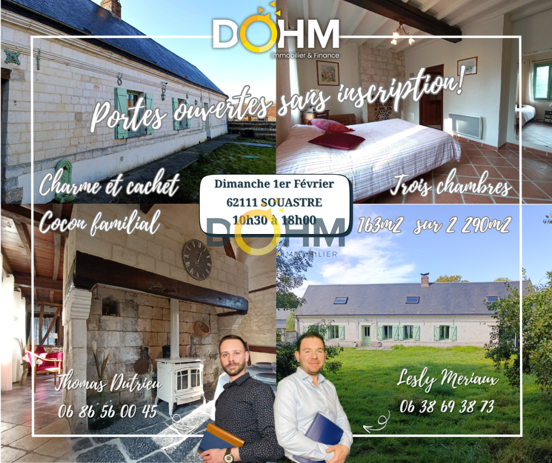 La maison coup de cœur – Charme et authenticité Opération portes ouvertes le Dimanche 1er Février de 10h30 à 18h! Sans inscription préalable. Située dans un village paisible à 24 km d’Arras, cette longère allie charme, confort et tranquillité. Elle offre un cadre de vie d’exception pour les amoureux de l’authenticité et du caractère. Le salon-séjour spacieux est sublimé par une cheminée Picarde, un poêle à bois Brisach et un insert à bois avec ventilateur d’air chaud électrique, tandis que la cuisine avec arrière-cuisine ouvre directement sur le jardin. Une chambre de plain-pied avec salle de bains et deux caves voûtées complètent le rez-de-chaussée. À l’étage, un vaste palier pouvant servir de bureau mène à deux chambres, dont une avec salle d’eau privative, avec la possibilité de créer de nouveaux espaces selon vos besoins. Le terrain clos de 2 290 m² comprend une parcelle constructible, un carport, des dépendances, un garage et une ancienne étable aménagée en bureau avec électricité et internet, parfaite pour le télétravail ou une chambre d’appoint. LE POINT FORT DE LA MAISON : les murs en pierres blanches de 50 cm d’épaisseur. Ils offrent une inertie thermique exceptionnelle : ils emmagasinent la chaleur en hiver pour la redistribuer et conservent la fraîcheur l’été, garantissant un confort naturel toute l’année. Cette maison se distingue également par sa toiture et ses fenêtres en excellent état, son chauffage gaz et bois, et un assainissement collectif conforme. Faible entretien et habitable immédiatement. DPE : E — GES : E Taxe foncière : 1 005 € Prix : 240 000 € FAI Contact : Lesly Meriaux – Dohm Immobilier Hauts-de-FranceTéléphone: O6 38 69 38 73 ------------------------------------------------- The Favourite House – Authentic 219-Year-Old Longhouse Located in a peaceful village just 24 km from Arras, this longhouse combines charm, comfort, and tranquility. It offers an exceptional living environment for lovers of authenticity and character. The spacious living room is enhanced by a traditional Picardy fireplace, a Brisach wood stove, and a wood insert with an electric hot-air fan, while the kitchen with utility room opens directly onto the garden. A ground-floor bedroom with bathroom and two vaulted stone cellars complete the main level. Upstairs, a large landing that can serve as a home office leads to two bedrooms, including one with a private shower room, with the possibility to create additional spaces according to your needs. The enclosed 2,290 m² plot includes buildable land at the rear, a carport, outbuildings, a garage, and a former stable converted into an office with electricity and internet — perfect for remote work or as a guest room. THE HOUSE’S MAIN ASSET: the 50 cm-thick white stone walls. They provide exceptional thermal inertia: they store heat in winter to redistribute it and keep the interior cool in summer, ensuring natural comfort throughout the year. The property also features a roof and windows in excellent condition, gas and wood heating, and compliant mains drainage. Low maintenance and ready to move in immediately. EPC: E — GHG: E Property tax: €1,005 Price: €240,000 agency fees included Contact: Lesly Meriaux – Dohm Immobilier Hauts-de-France +33 6 38 69 38 73
